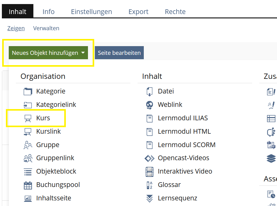 Mit diesen erweiterten Berechtigungen können Sie dann in bestimmten Bereichen der Lernplattform Kurse, Gruppen und andere Objekte einrichten.